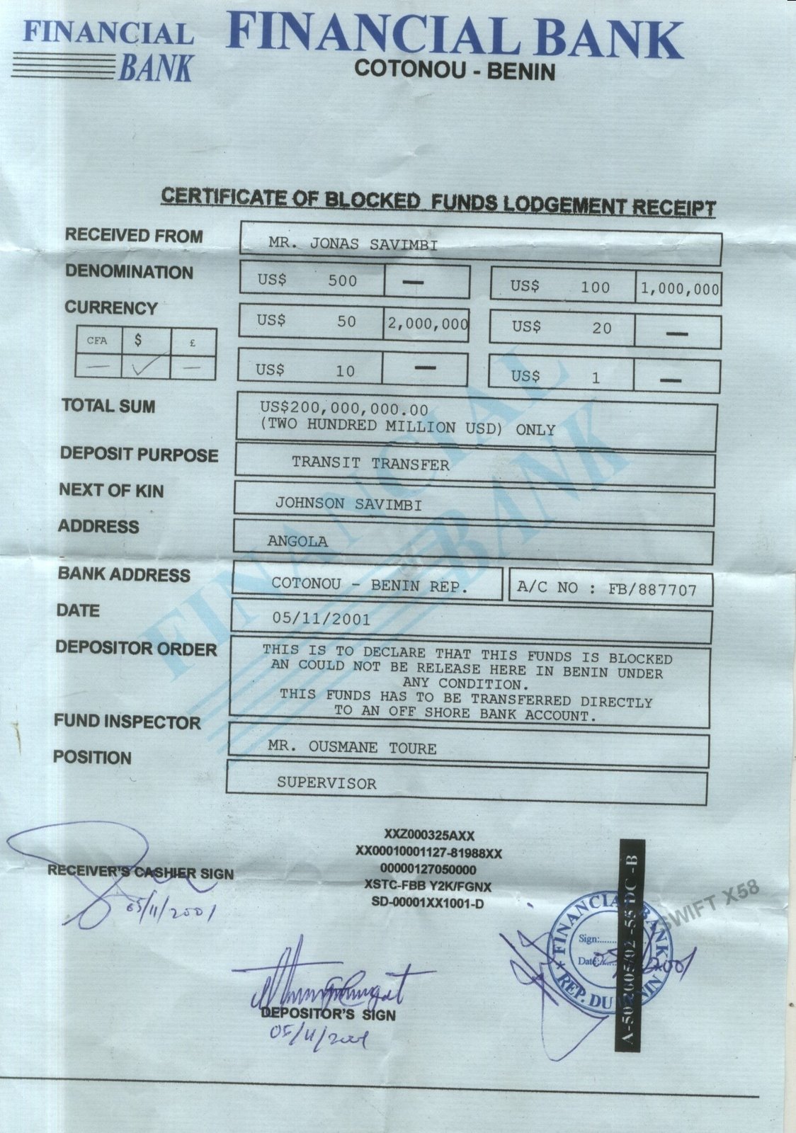Savimbi blocked fund withdraw in Benin November 5 2001 JPG image